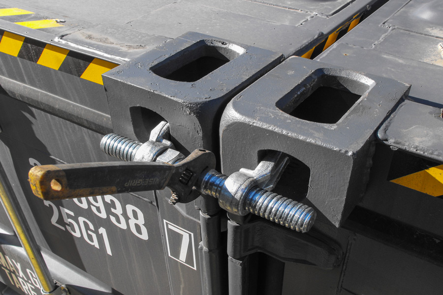 橋鎖/橋碼,用于對相鄰兩列最上層的集裝箱進行橫向或縱向連接,以分散主綁扎設備的負荷。橋鎖的使用方法較簡單,只需將橋鎖的兩個端架(鎖鉤頭)分別插入相鄰兩集裝箱的角件孔內,再旋轉調節螺母,即可把集裝箱連接拉緊。